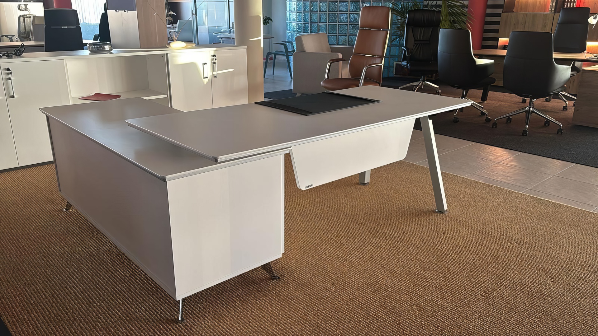 Despacho de dirección AT de Pina Mobiliario combina un estilo ejecutivo refinado con soluciones modulares y materiales de alta calidad. Su diseño minimalista y geométrico aporta presencia y profesionalismo al espacio directivo, mientras que su funcionalidad modular permite adaptarse a diferentes configuraciones de oficina. Ideal para ejecutivos que valoran el confort, la eficiencia y una imagen corporativa sólida, el modelo AT integra escritorios amplios, almacenamiento auxiliar y un acabado cuidado que transmite liderazgo, orden y distinción.