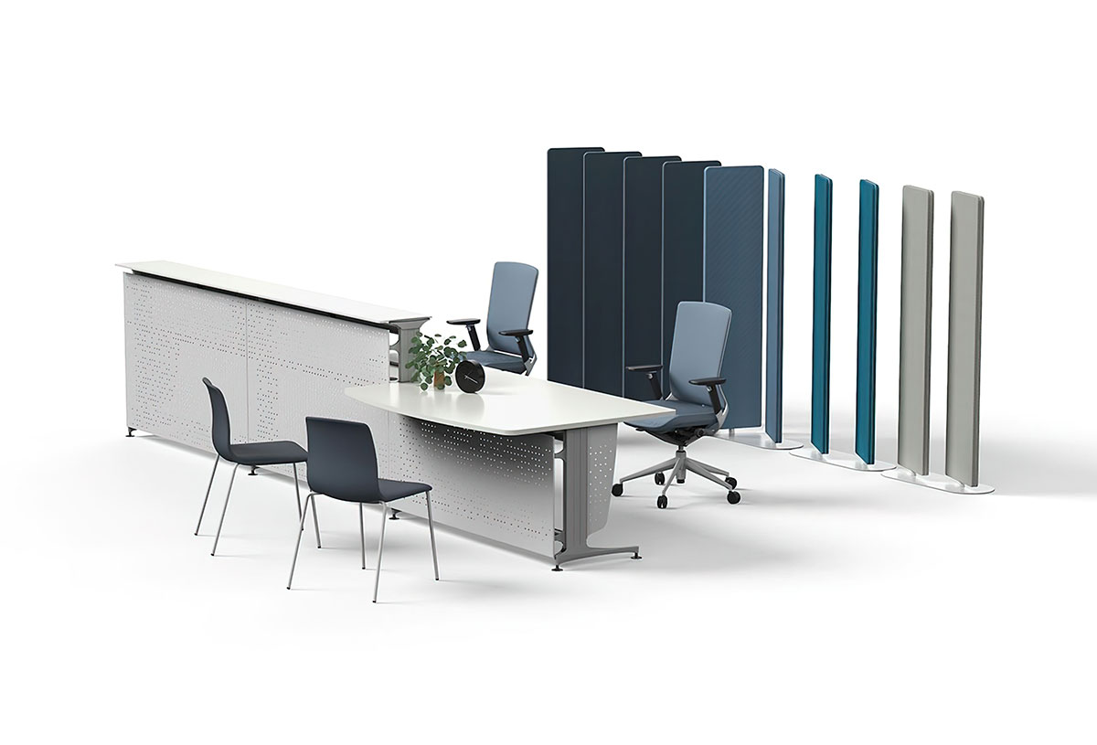 El sistema permite reorganizar visualmente áreas de trabajo sin necesidad de estructuras fijas, facilitando la adaptabilidad a cambios de distribución o flujos de trabajo variables. Su presencia equilibra funcionalidad y diseño, aportando orden y claridad formal a cada entorno.