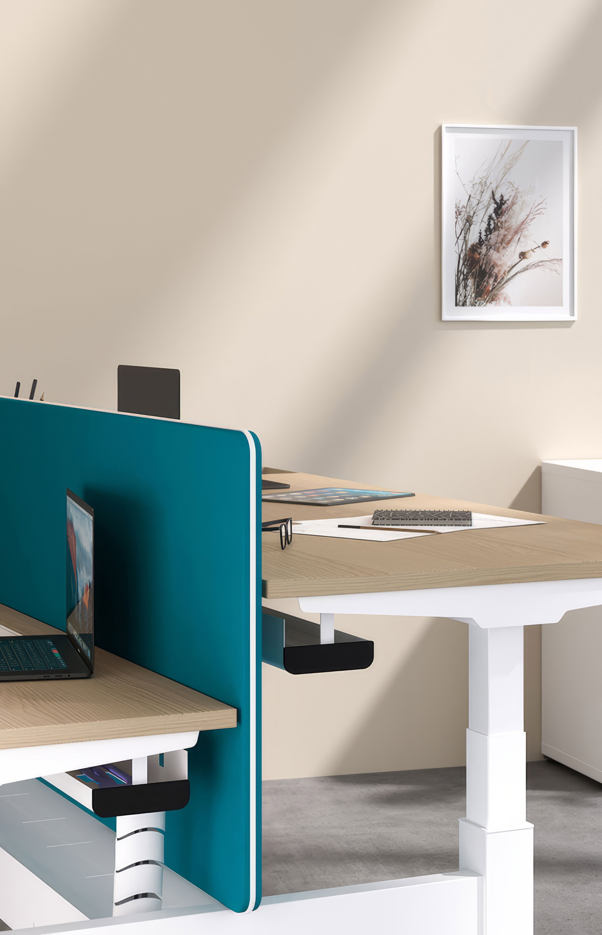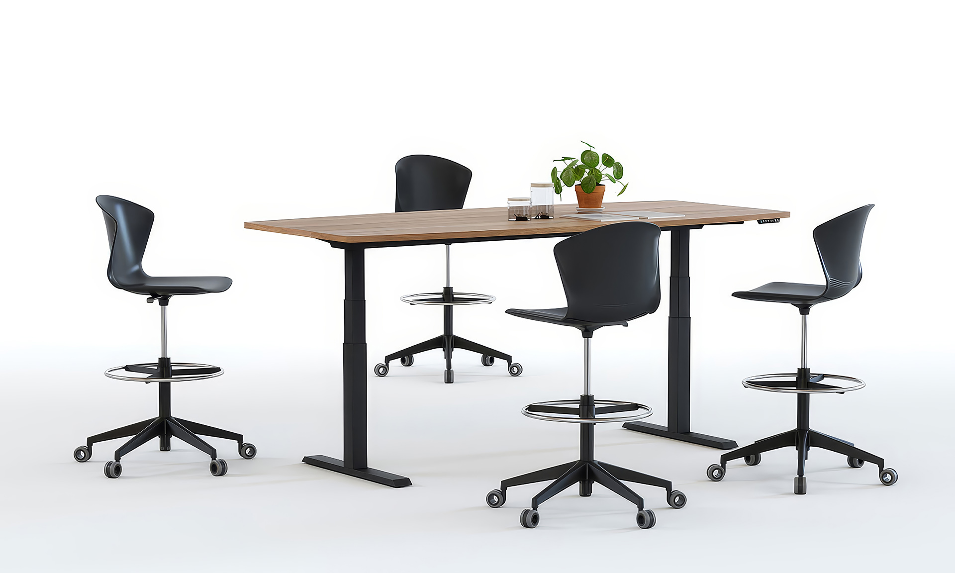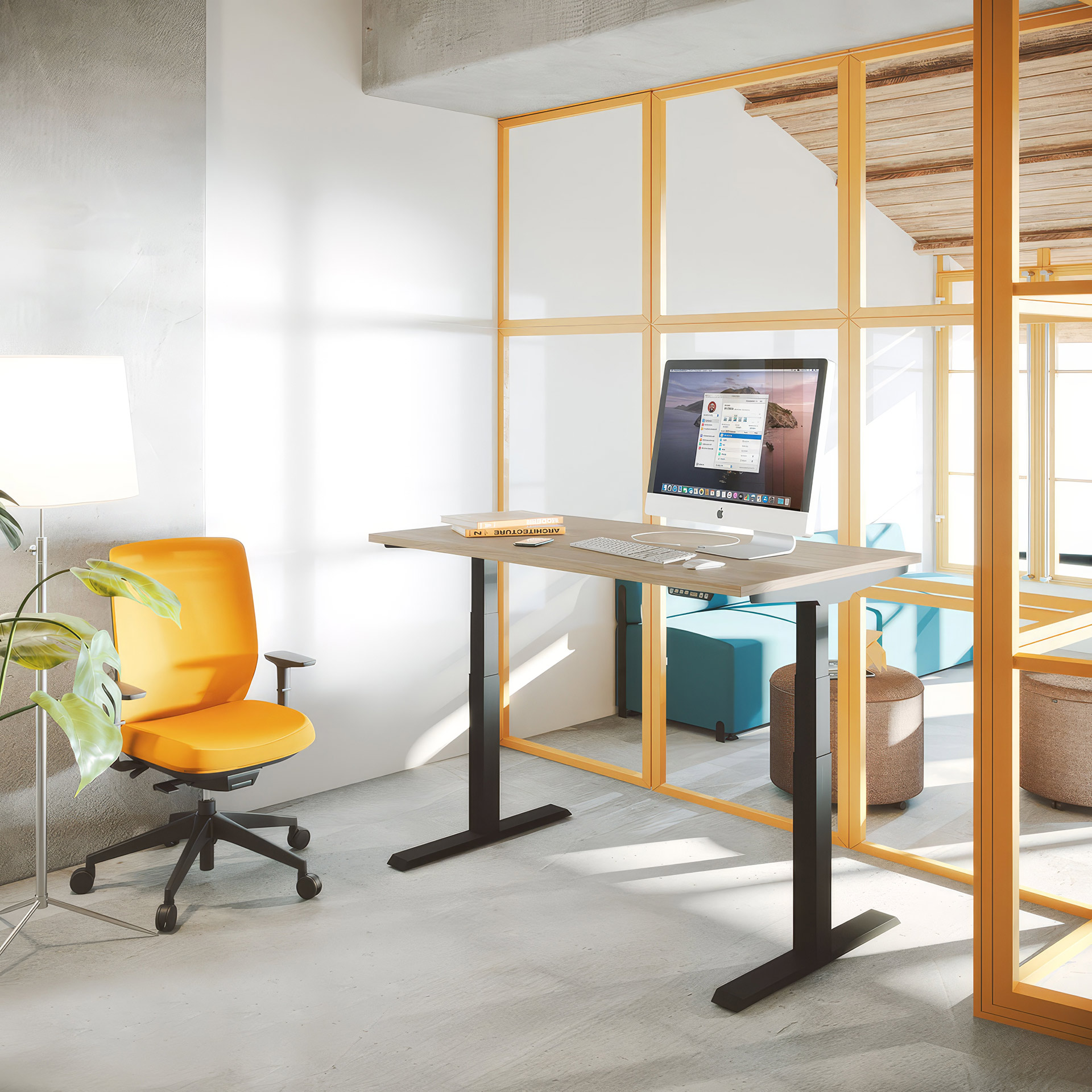Incorpora un pulsador ergonómico y un sistema de elevación a gas compensado, permitiendo ajustar la altura de forma suave y natural. Además, admite accesorios como faldones o divisorias, ampliando la funcionalidad del puesto.