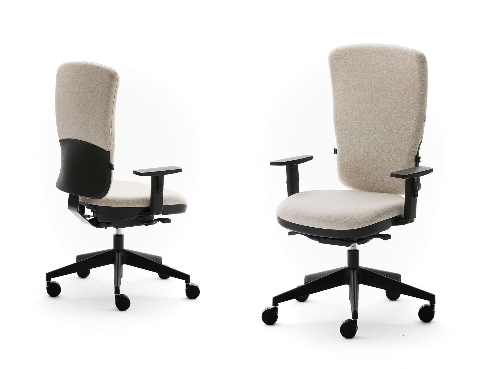 El respaldo se ajusta en altura (Up-Down) y la silla incluye regulación independiente del volumen lumbar mediante botones laterales, facilitando el ajuste fino para usuarios de diferentes tamaños y contextos. El mecanismo sincro y la base de cinco radios en poliamida reforzada con fibra de vidrio, o bien la opción de aluminio pulido, hacen de la Conecta una opción versátil para oficinas corporativas, ambientes contract o teletrabajo intensivo.