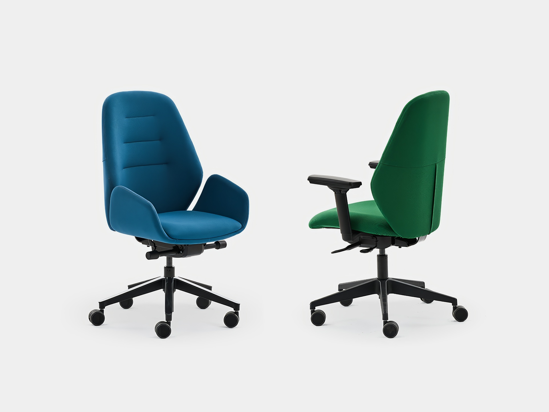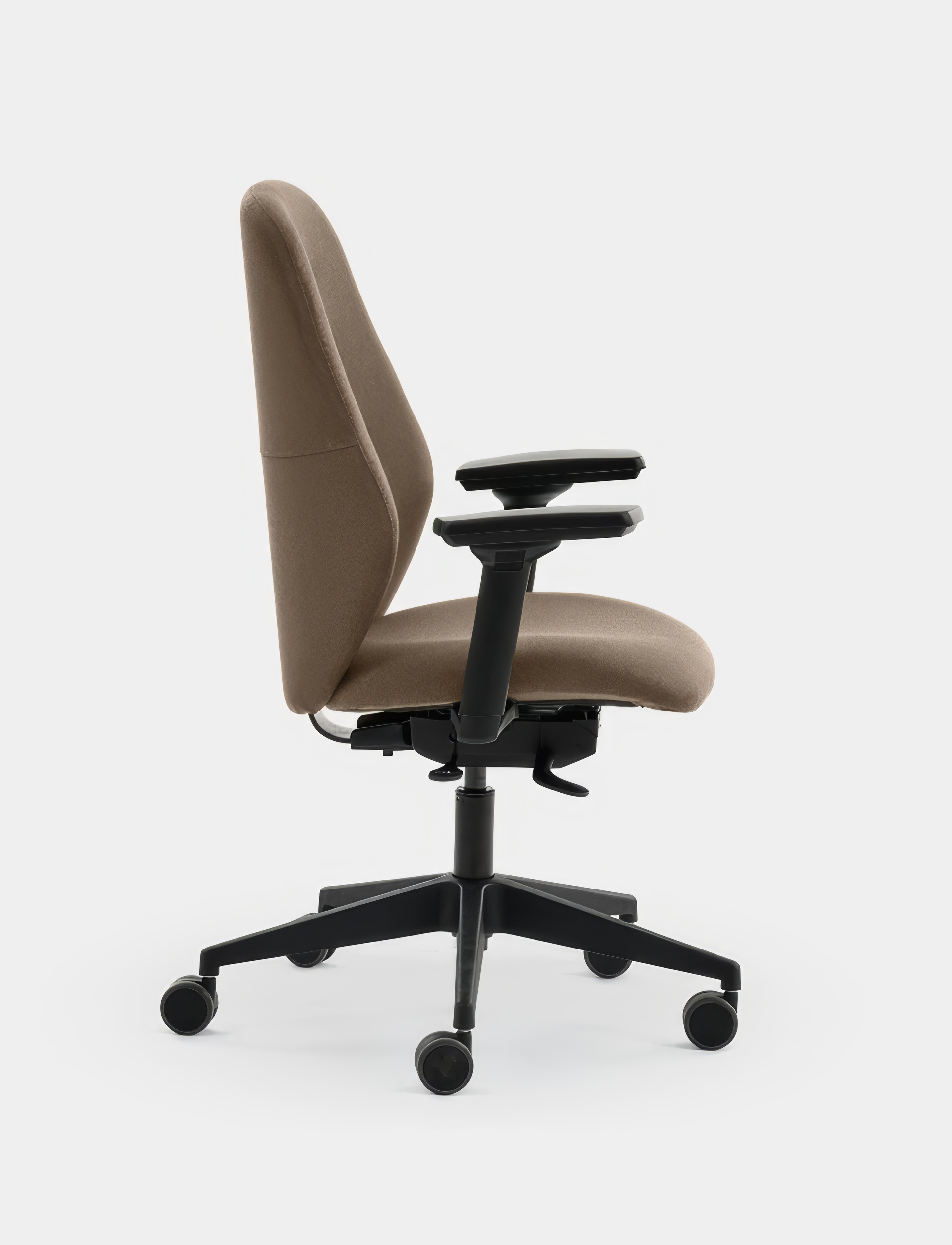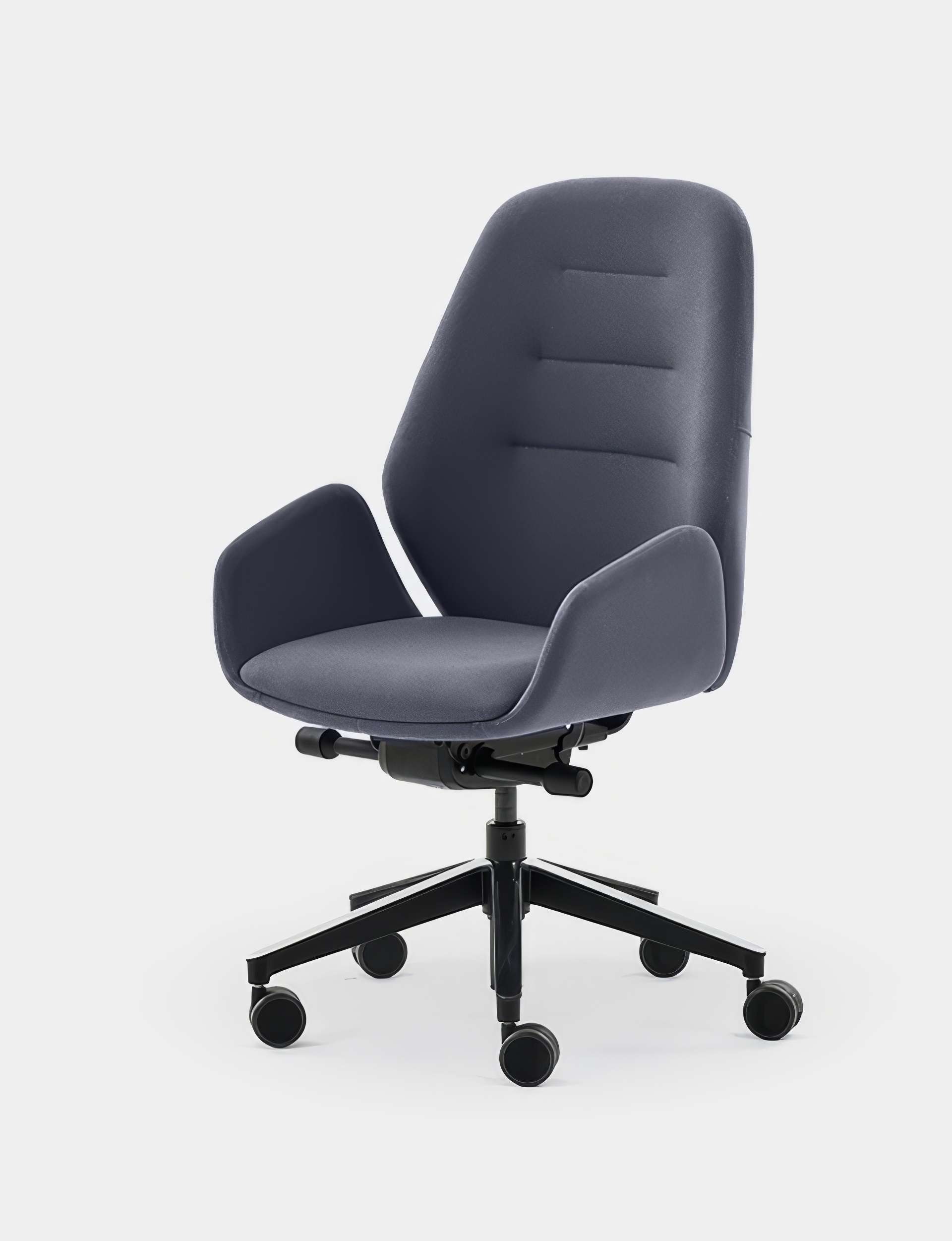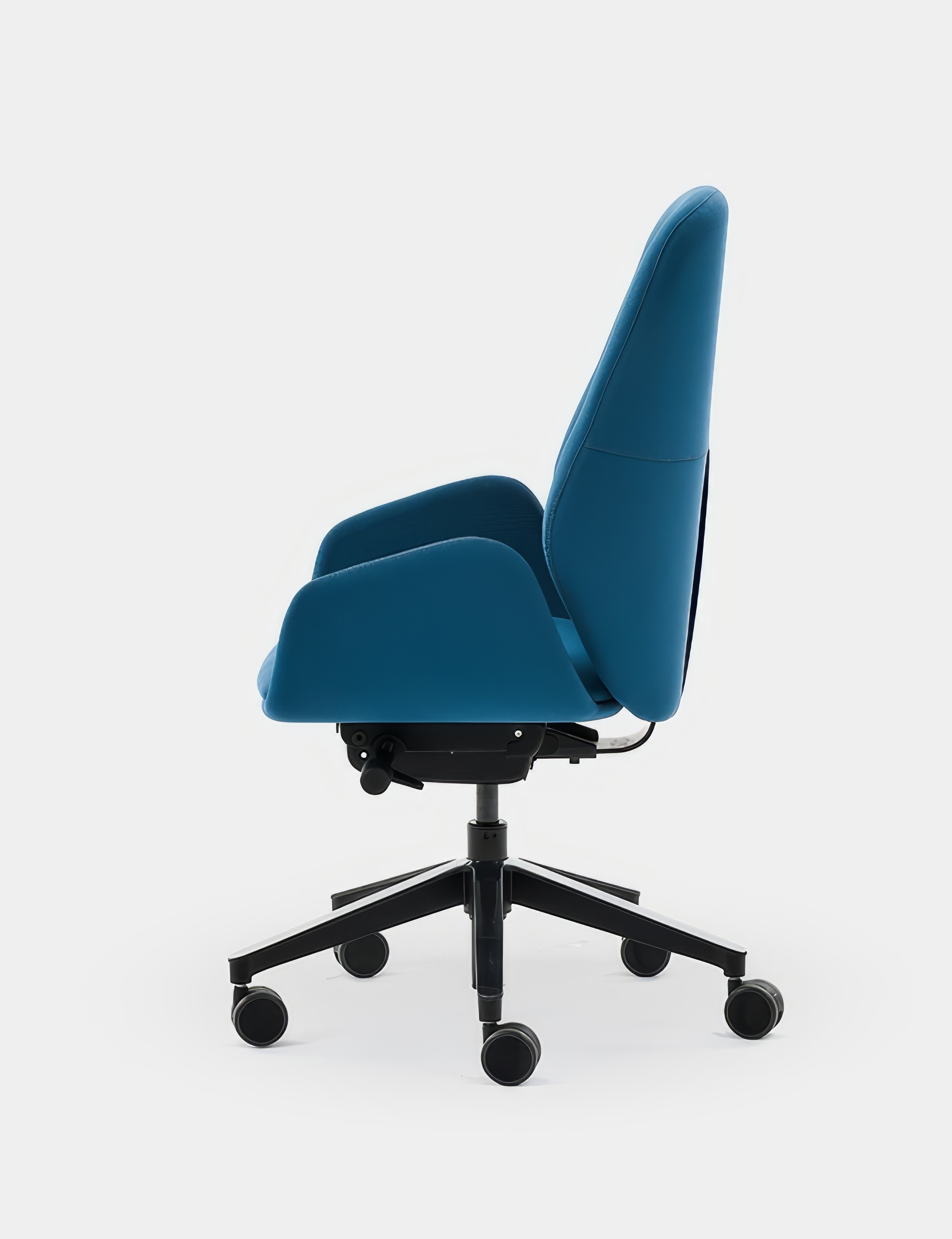 El asiento, disponible en dos modelos, cuenta con espuma de alta densidad y capa viscoelástica para mejorar la comodidad incluso durante un uso prolongado. Su mecanismo sincro autopesante sincroniza el movimiento del asiento y respaldo, garantizando flexibilidad y apoyo constante. La base piramidal de poliamida y las ruedas autofrenadas de 65 mm aportan estabilidad y resistencia para un uso intensivo en oficina o teletrabajo. Los brazos son regulables y personalizables según el modelo elegido.